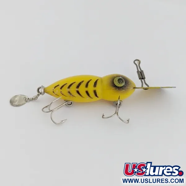 Waga 1/4 oz (7 g) sprawia, że Hellbender jest wszechstronną przynętą zarówno do rzutów, jak i do trollingu. Wykończony w klasycznym schemacie kolorystycznym Tiger, posiada żółty korpus z wyraźnymi czarnymi pasami na bokach i przyciemnioną głową. Wyraźny metalowy ster został zaprojektowany tak, aby sprowadzić przynętę na głębokość 6,5 stopy (2 m). Z tyłu, na krętliku, zamocowano małą srebrną paletkę typu „willow”, która dodaje dodatkowych błysków podczas prowadzenia. Ten model o długości 2 1/4" (5,5 cm) posiada kod produktu 24503. Dwie kotwiczki są zamocowane do korpusu za pomocą tradycyjnych wkrętów z oczkiem. Duże malowane oczy z zielono-czarnymi tęczówkami stanowią wyraźny punkt wizualny. Ocena 4/5, obudowa wykazuje minimalne ślady użytkowania i zachowuje swój oryginalny charakter.