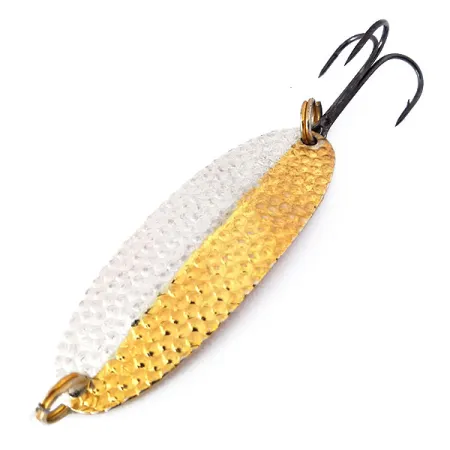 Charakterystyczna młotkowana powierzchnia pokrywa dwukolorową płaszczyznę tej klasycznej wahadłówki, wykończonej w układzie pół na pół w kolorach młotkowanego złota i srebra. Ten konkretny egzemplarz Williams Wabler W50 o kodzie produktu 10494 waży 14 g (1/2 oz) i mierzy 6,7 cm (2 3/4") długości. Powłoka z prawdziwego srebra na jaśniejszej stronie to znak rozpoznawczy kanadyjskiego producenta – tradycja ta sięga początków produkcji firmy w 1914 roku. Charakterystyczne wzdłużne przetłoczenie biegnące przez środek ma na celu zapewnienie stabilnej pracy podczas prowadzenia przynęty, zarówno przy szybkim, jak i wolnym tempie. Ten egzemplarz, oceniony na 5/5, prezentuje się bardzo dobrze, zachowując oryginalne uzbrojenie oraz ostrą czarną kotwicę. Zaprojektowany głównie z myślą o szczupakach i sandałach, Wabler pozostaje podstawowym elementem wyposażenia pudełek wędkarskich od czasu przeniesienia pełnej produkcji do Kanady w 1978 roku. Małe kółka łącznikowe na obu końcach pozwalają na pewne mocowanie i właściwe ułożenie haka.