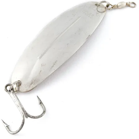 Srebrna powłoka definiuje klasyczną estetykę tego egzemplarza, będąc znakiem rozpoznawczym marki Williams, który zapewnia wyraźny błysk pod wodą. Ważąca 1 oz (28 g) ciężka wahadłówka została stworzona z myślą o dalekich rzutach i łowieniu na dużej głębokości. Charakterystyczne wzdłużne przetłoczenie zapewnia stabilność pracy, dzięki której seria Wabler stała się stałym elementem pudełek wędkarskich od czasu rozpoczęcia seryjnej produkcji w 1920 roku. Ten konkretny model Williams Wabler W70, oznaczony kodem produktu 19103, kontynuuje tradycję kanadyjskiej produkcji. Zachowana w stanie 4/5, srebrna powłoka jest w bardzo dobrej kondycji, wykazując jedynie minimalne oznaki wieku vintage, przy jednoczesnym zachowaniu jasnej, lustrzanej powierzchni. Na wklęsłej stronie znajduje się charakterystyczne tłoczenie „WILLIAMS WABLER PATENTED” – detal ceniony przez kolekcjonerów. Wyposażona w solidną kotwicę i krętlik baryłkowy, błystka ta pozostaje w pełni funkcjonalnym wyborem do połowu dużych szczupaków lub sandaczy.