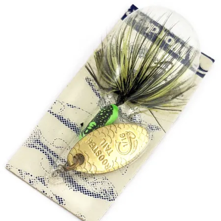 Przy wadze 3/32 oz (2,6 g), złote skrzydełko w kształcie liścia wierzby posiada charakterystyczne wytłoczone logo Yakima Bait oraz drobny wzór łuski, mimo że fizyczne oznaczenie na paletce to 1/16. Ten kolekcjonerski egzemplarz o kodzie produktu 18814 zachowuje swój oryginalny 5-centymetrowy (2 cale) profil wraz z jaskrawozielonym korpusem zdobionym czarnymi kropkami. Chwost został wykonany z ręcznie wiązanych żółto-czarnych piór koguta, które pozostają gęste i doskonale zachowane. Jako produkt nieużywany, przynęta znajduje się w oryginalnym opakowaniu, a jej stan oceniono na 6. Ta konkretna wersja od Yakima Bait Company z Granger w stanie Waszyngton nawiązuje do tradycyjnej linii projektowej stworzonej przez Howarda Wordena w latach 50. XX wieku. Konstrukcja opiera się na prostym stelażu z drutu oraz kotwiczce niemal całkowicie ukrytej w gęstym chwoście z piór.