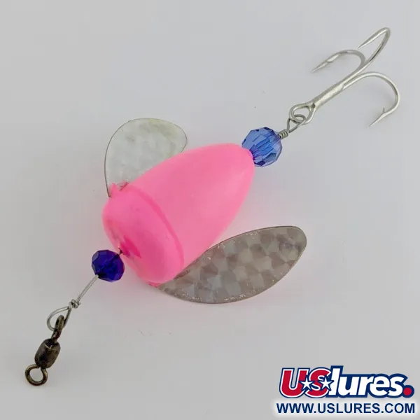 Jaskraworóżowy piankowy korpus to znak rozpoznawczy tego 11-centymetrowego (4 1/4") modelu Worden's Spin-n-Glo, zaprojektowanego przez Yakima Bait do łowienia w dryfie. Dwa srebrne skrzydełka w szachownicę obracają się w nurcie, umieszczone pomiędzy fasetowanymi niebieskimi koralikami na centralnym drucie. Ten konkretny egzemplarz, oznaczony kodem produktu 24451, waży 1/4 oz (8 g) i zawiera fabryчну kotwicę oraz krętlik baryłkowy zapobiegający skręcaniu żyłki. Stan oceniany na 5/5, fluorescencyjne wykończenie i odblaskowe wzory na skrzydełkach są doskonale zachowane. Wyporność korpusu wynosi przynętę w strefę brań, a wirujące skrzydełka zapewniają wyraźną widoczność w wodzie.