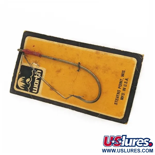 Niklowanie zapewnia czyste, błyszczące wykończenie tego haczyka antyzaczepowego, zaprojektowanego do łowienia w gęstej roślinności. Pojedyncza druciana osłona jest starannie przymocowana do oczka ręcznie owiniętą czerwoną nicią, co chroni grot przed zaczepami. Firma Worth wyprodukowała ten model, oznaczony kodem 24486, w swoim zakładzie w Stevens Point, Wisconsin. Haczyk, wciąż przymocowany do oryginalnej czarno-żółtej karty, jest w nieużywanym stanie z oceną 6. Grafika na opakowaniu przedstawia stare logo ze stylizowanymi elementami gór i wody, typowe dla wczesnego wizerunku marki tego producenta.